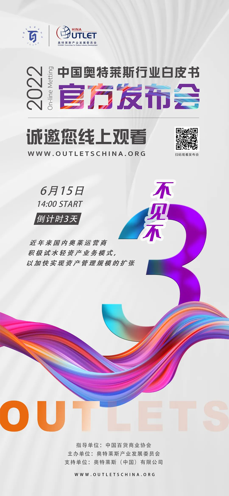 2022年6月15日14:00,《2022年中國(guó)奧特萊斯行業(yè)白皮書》線上發(fā)布會(huì)即將正式開(kāi)始,本次發(fā)布會(huì),將對(duì)國(guó)內(nèi)零售市場(chǎng)及奧萊產(chǎn)業(yè)引入中國(guó)20年發(fā)展的經(jīng)驗(yàn)及機(jī)遇做出全新解讀。