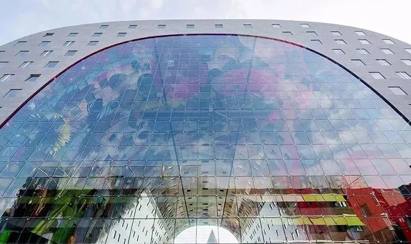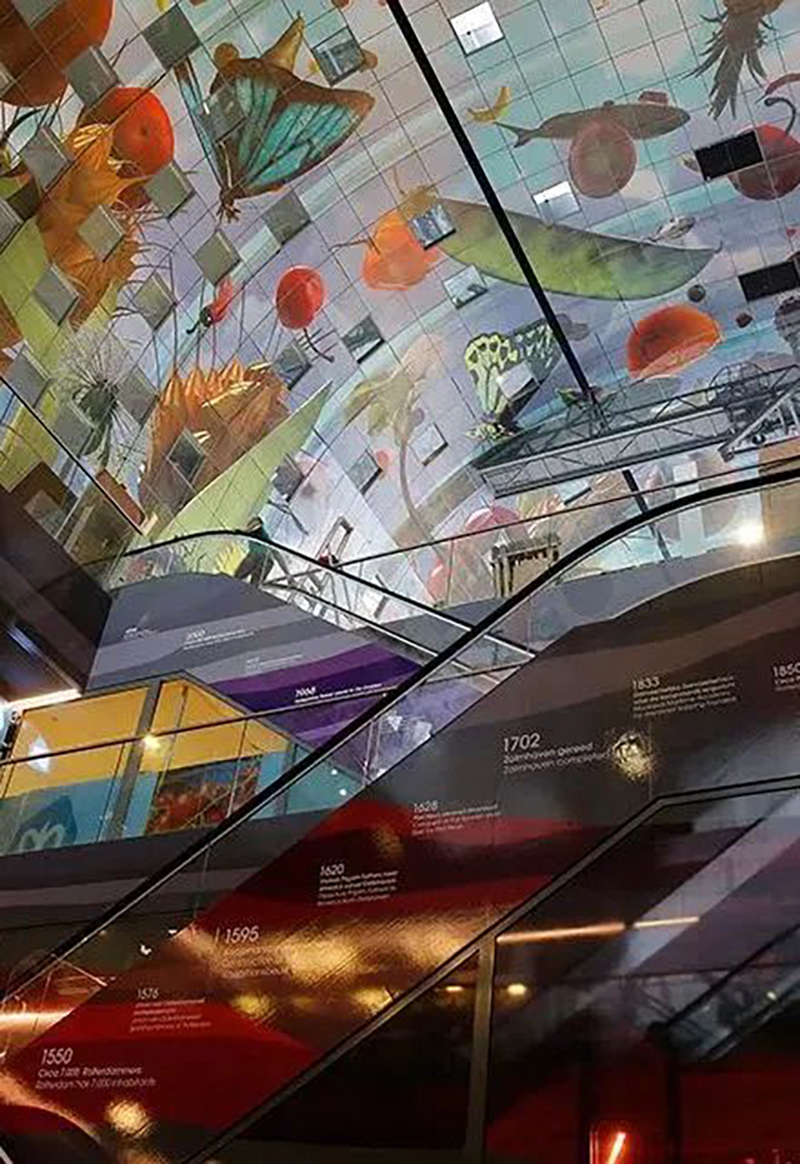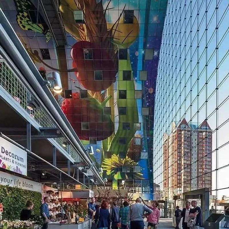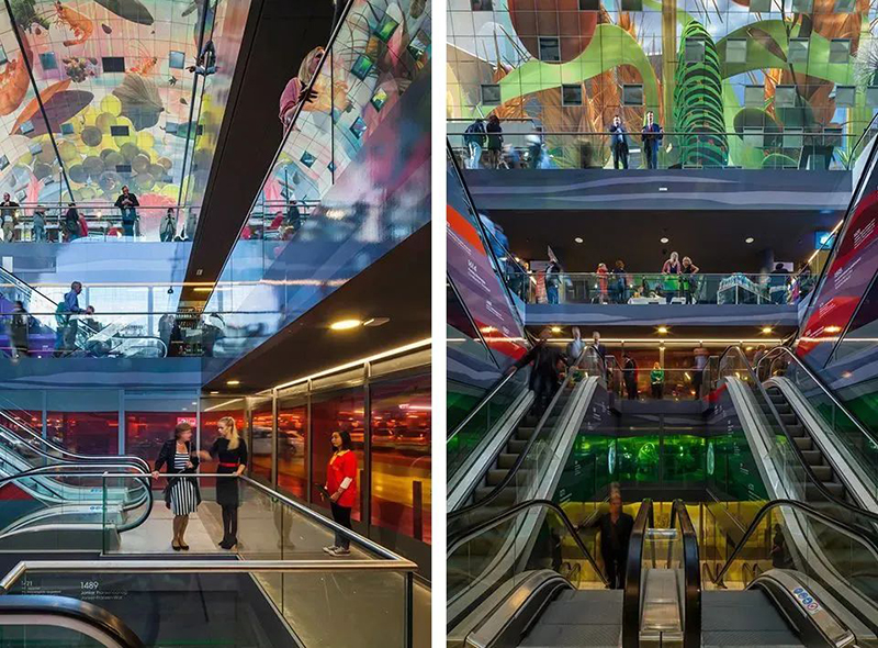 建筑弧形的內(nèi)面11000㎡的彩色藝術(shù)品“豐饒之角”,是由Arno Coenen和Iris Roskam創(chuàng)作而成,將水果、魚、面包、鮮花與附近的大教堂等元素重疊交織而成。項(xiàng)目除兼?zhèn)鋫鹘y(tǒng)菜市場銷售食材的功能外,消費(fèi)者還能在“美食市集”享受餐飲的服務(wù)和游逛的體驗(yàn),大大滿足人們的訴求。