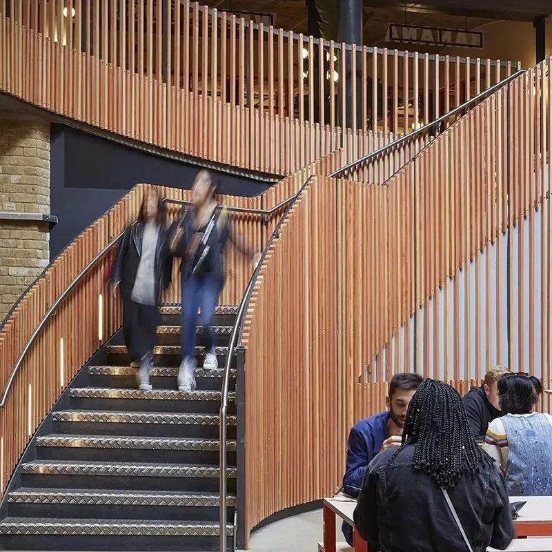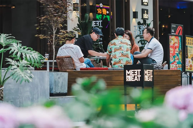 在國內(nèi),傳統(tǒng)美食廣場逐漸黯淡退場,人們更希望在美食消費(fèi)場景享受到輕松愉悅的聚會和社交。MEET&EAT的創(chuàng)造團(tuán)隊比褐就通過突出“MEET”的“人與人之間的社交”來塑造場景。為突出社交感,則放大公區(qū)外部的階梯座位,也使之與成都的街巷文化進(jìn)行融合。