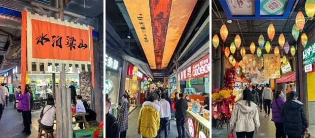宋朝食間是以大宋文化為主題的街區(qū),還原宋朝文化、藝術(shù)、生活場景,加入水泊梁山和水滸英雄好漢場景元素,打造了沉浸式宋風實景生活餐飲主題街區(qū)。