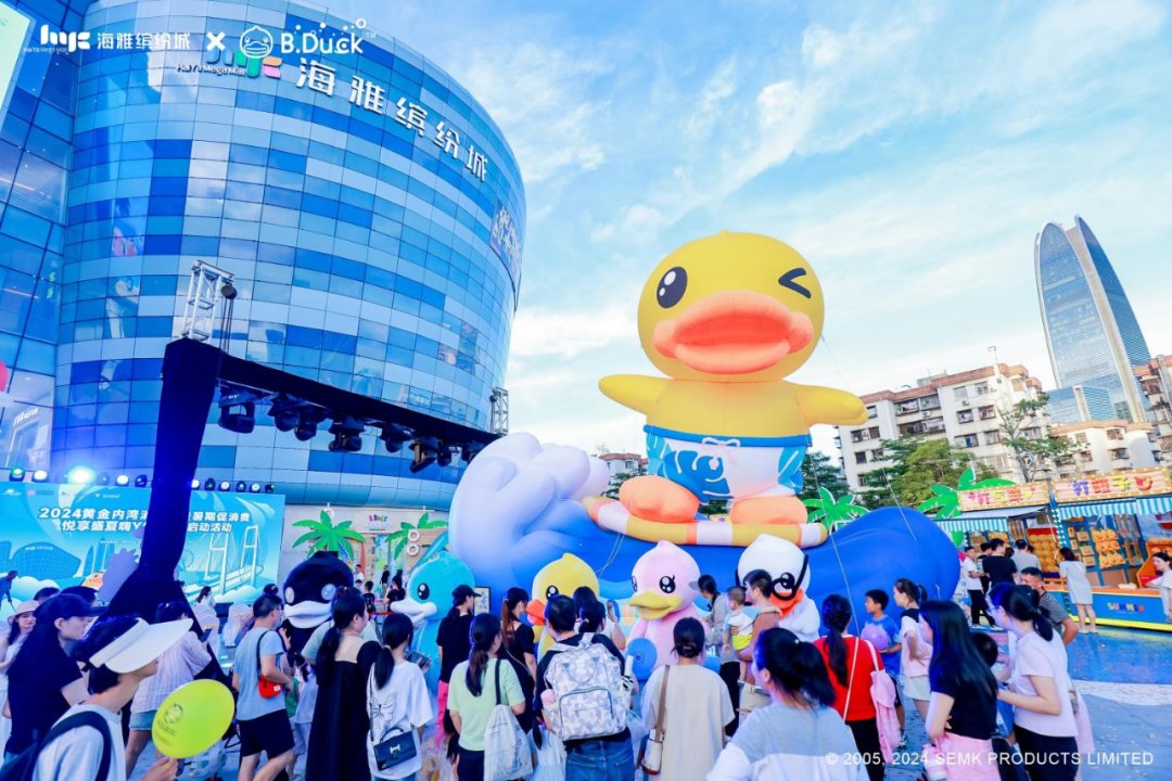 時值暑期,深圳海雅繽紛城邀請B.Duck品牌創(chuàng)辦人“鴨爸爸”許夏林,以及市/區(qū)商務局、中山商務局、新安街道辦、市零售商業(yè)行業(yè)協會等官方代表,共同開啟了2024黃金內灣消費季暨暑期促消費——悅享盛夏嗨Ya狂歡購系列活動的序幕,成功完成中國第一自主IP B.DUCK小黃鴨的“B.DUCK嗨YA狂歡節(jié)全國首展”。
