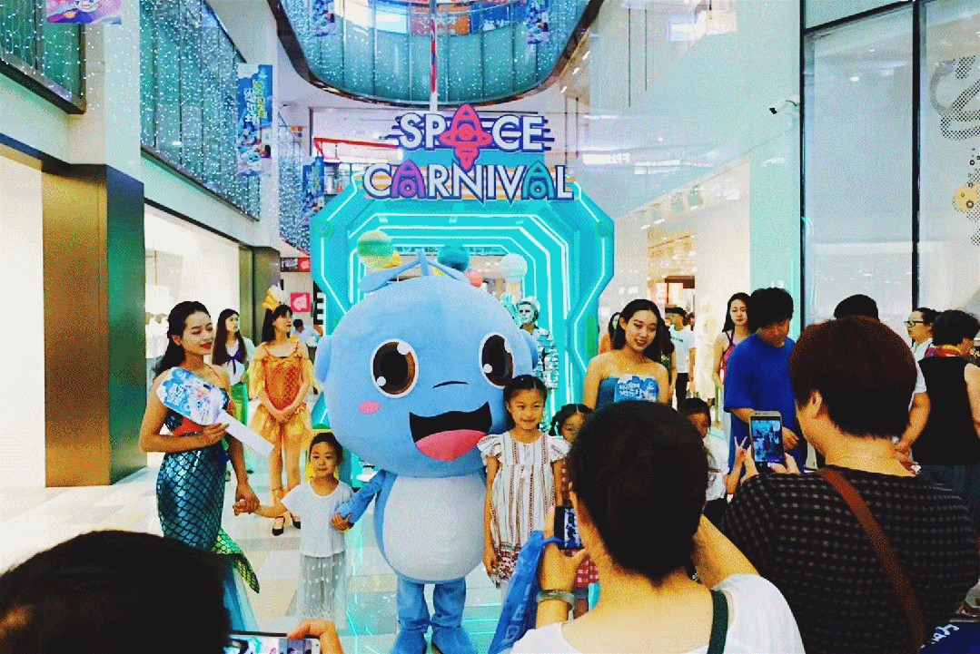 對于城市而言,天津作為海濱城市,海洋元素的小鯨魚IP衍生也是在地文化內(nèi)容發(fā)酵的重要一環(huán)。原創(chuàng)主題IP“鯨仔”作為天津第一個(gè)購物中心主題IP,擬人化形象助力品牌傳播,通過鯨仔IP的逐步成長,在地文化也將植入這種符號化、人格化的形象,塑造了多場商業(yè)美陳、平面延展、在線客服、抖音網(wǎng)紅、巡游快閃等活動,把商業(yè)和精神消費(fèi)相融合,快速匯聚人氣,打開城市發(fā)展的認(rèn)知度、文化力和性格定位。