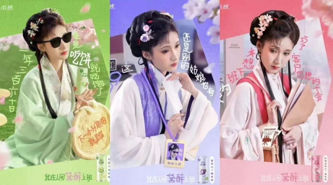 比如在五一調(diào)休這個(gè)社會(huì)熱點(diǎn)話(huà)題中,RIO雞尾酒請(qǐng)出了大IP林黛玉,推出一組“我在人間黛醉上班”的海報(bào),每一句都非常“有那味兒”。這組海報(bào)以林黛玉的形象為核心,將她的古典韻味與現(xiàn)代職場(chǎng)生活巧妙融合,每一幅都充滿(mǎn)了獨(dú)特的韻味與深意。