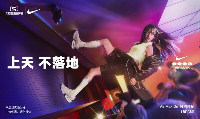 提及“發(fā)瘋”,耐克的「上天不落地」?fàn)I銷(xiāo)大事件也是不得不提一提的。借助新發(fā)布系列的契機(jī),耐克與天貓超級(jí)品牌日牽手,通過(guò)與潮流人群共創(chuàng),借助城市文化加強(qiáng)對(duì)潮流藝術(shù)的表達(dá),深度溝通年輕人群,在社交平臺(tái)上號(hào)召網(wǎng)友們玩轉(zhuǎn)“先瘋”穿搭共創(chuàng)。