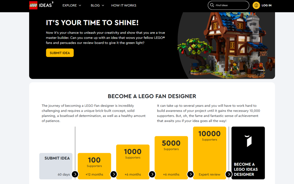 樂高通過“樂高創(chuàng)意”(LEGO IDEAS)這一在線創(chuàng)意平臺,為全球樂高愛好者提供了展示自己作品的機會。在線上創(chuàng)意社區(qū)這一開放互動平臺中,用戶可以提交各種創(chuàng)意作品,獲得高投票的優(yōu)秀作品可成為樂高的正式產(chǎn)品。此時,品牌與用戶之間不再是傳統(tǒng)的買賣關系,而是合作共創(chuàng)的伙伴。