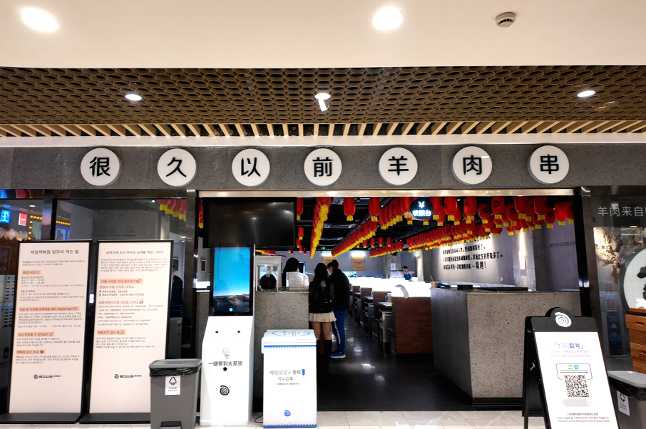 值得一提的是,在國家開放免簽政策,韓國旅客接踵而至,其統(tǒng)一的打卡模式直接帶火了“很久以前羊肉串”,尚未到正式的用餐時間,該門店前已開始排隊,其中大部分等位人員為韓國游客。他們除了可以在店員的輔助下使用烤爐現(xiàn)烤現(xiàn)吃,還將門店附贈的“冰涼貼”作為了打卡的必備項目。