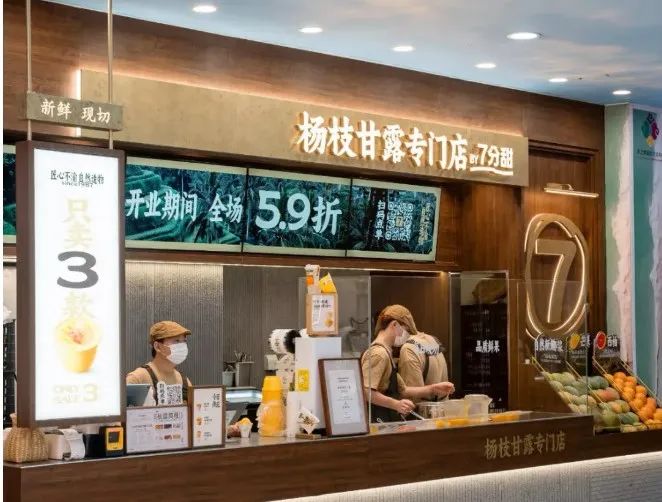 去年,七分甜的首家楊枝甘露專門店在上海長寧龍之夢開業(yè),在產(chǎn)品方面,專門店僅售三款產(chǎn)品,分別是1987經(jīng)典楊枝甘露、2007鮮芒楊枝甘露、楊枝甘露Gelato,分為碗裝、杯裝和冰淇淋,定價在15-20元。在店型方面,走小店模式,不設(shè)堂食。專門店面積大約只有20平方米左右,目前僅支持下單后排隊自取。在裝修風(fēng)格上,店內(nèi)裝修以原木配色為主,主打簡約風(fēng)。在鮮果陳列區(qū)擺放了制作楊枝甘露所需要的椰子、芒果、西柚等原料,采用明檔吧臺在顧客面前現(xiàn)切現(xiàn)做,讓消費者直觀感受產(chǎn)品的制作流程。